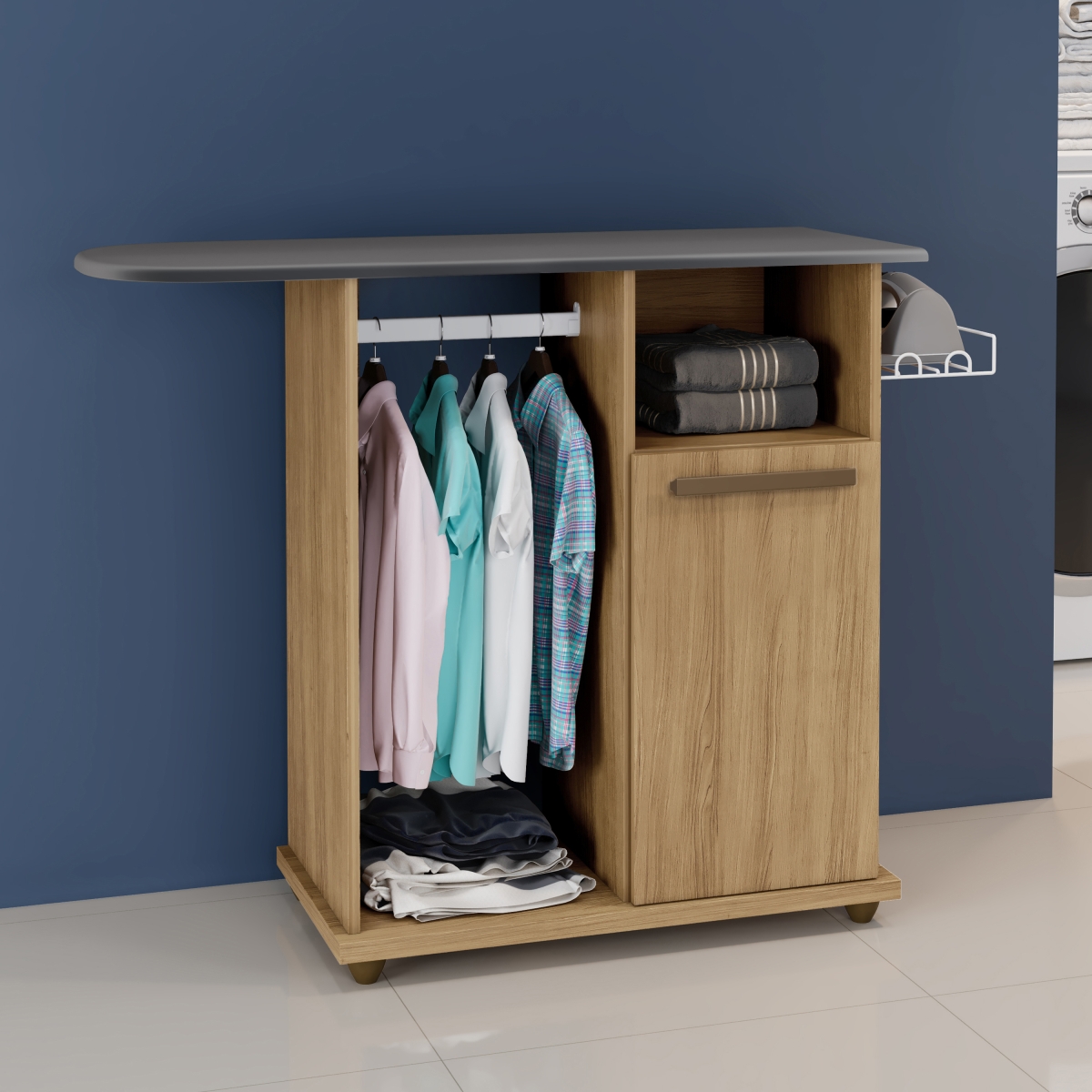 Com design funcional, a Tábua de Passar Macapá oferece conforto na hora de passar roupas e ainda ajuda na organização do ambiente com espaço para guardar itens. Conta com 1 porta, 1 prateleira e suporte para ferro. A prancha é revestida com tecido térmico metalizado. Medidas Da Tábua Montada: Altura: 80cm Largura:103cm Profundidade:30cm Caracteristicas: Quantidade de Portas:01 Quantidade de Prateleiras:01 Garantia:3 Meses Observações: